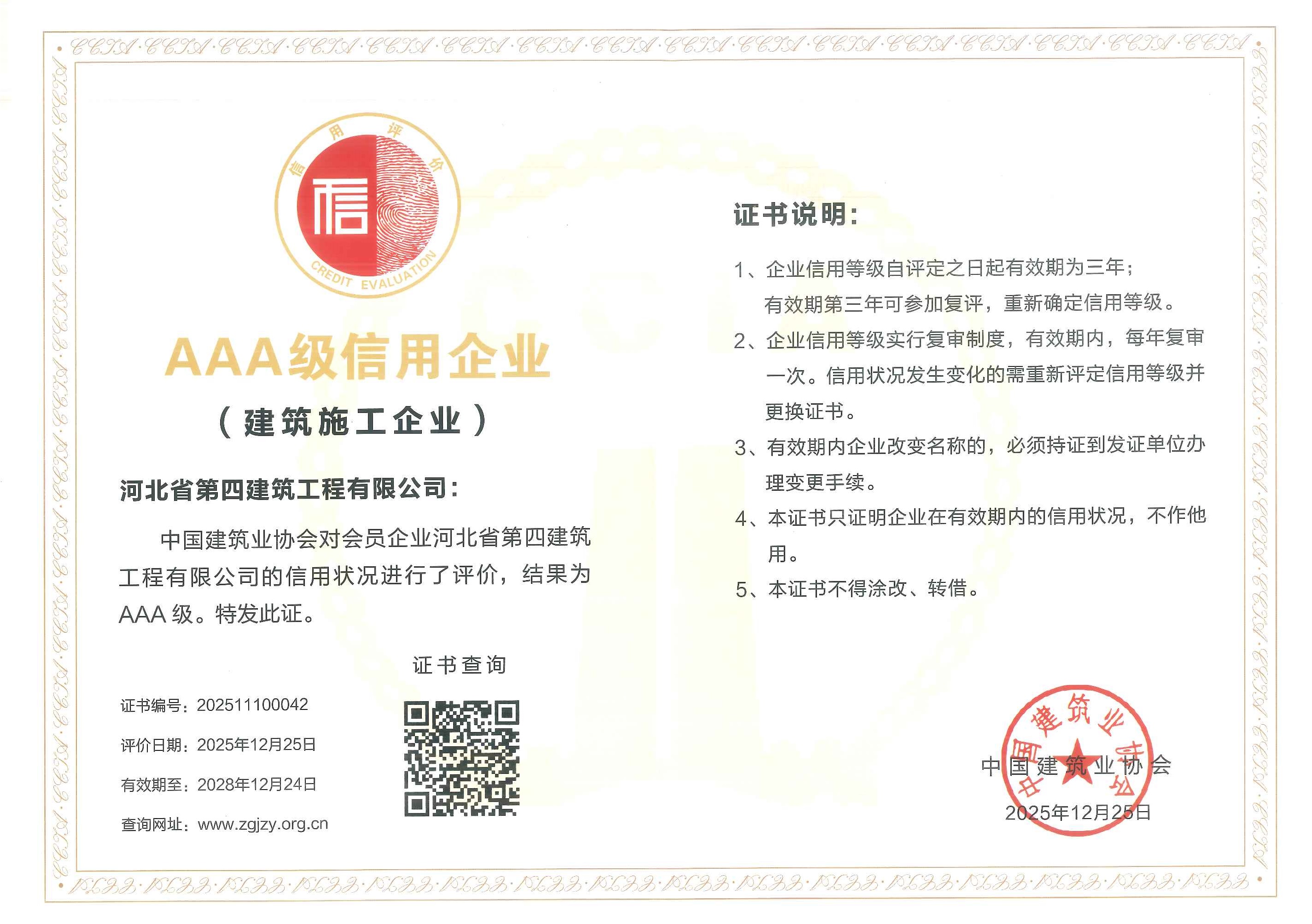 河北省建协AAA企业信用等级证书