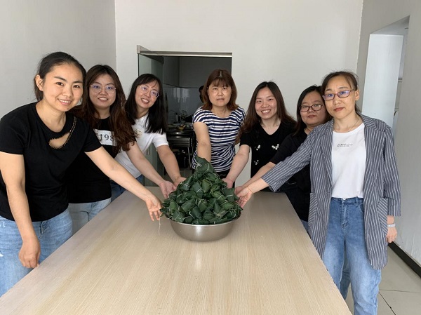 上午9点,粽叶、糯米、大枣整齐地摆上桌。大家边包边聊,其乐融融。包粽子现场,熟悉包粽子的能手们飞快地拿起粽叶,两手一窝卷成漏斗状,填米、加枣、压紧、扎绳,一气呵成。她们还充当起“老师”的角色,教“新手”职工包粽子,手把手现场教学,老师”教得仔细,“学生”学得认真,但要做出馅料十足、外观漂亮的粽子还是需要费一番功夫的。随着技巧的不断娴熟,一个多小时的时间,形状各异、大小不一的一百多个粽子就堆积成山了,预算科副科长窦梦娜说:“我们包粽子的水平真是越来越高了,明年再包会更好!”此时每个人心里都洋溢着一股喜悦之情,有初学一门手艺的欣喜,有参与集体活动交流感情的满足。