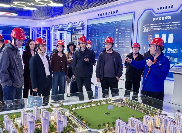 随后,观摩团来到“智慧安全体验中心”,沉浸式体验了VR危险感受、安全帽撞击、安全带坠落等安全教育设备。“赛博感”十足的VR危险感受体验区引起了众人兴趣,在讲解员引导下,一位观摩人员亲身体验了高空坠落、触电等事故场景,并分享感受:“戴上VR眼镜后,有一种身临其境的感觉,非常真实。”同时,观摩人员还参与了知识问答、虚拟灭火等丰富的互动环节,感受智慧工地的魅力。