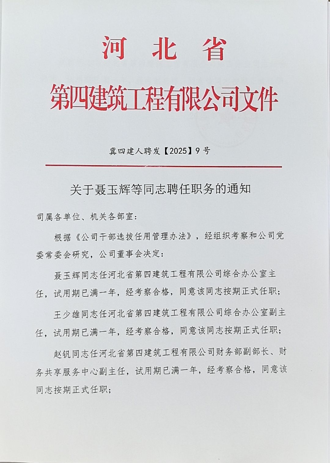 河北四建:关于曹迎新等同志聘任职务的通知